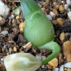 マユハケオモトの成長 変化のなかったマユハケオモトに 2枚目の葉らしきものを発見! 写真① 正面から 写真② 横からアップ 写真③ 白い種が萎んで浮いてます😄 写真④ 他の子たちは変化無し 消えてしまいそうな子も😰