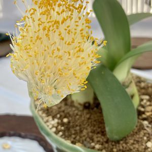 【マユハケオモト(眉刷毛万年青、ハエマンサス)】 南アフリカ原産、ヒガンバナ科多年草 花は花弁6枚、雄しべ6本、雌しべ1本。それらが多数集まって径3~7cmの眉刷毛のような花序を花茎の先端に形成する。 先が黄色いのが雄しべで、先がさけているのが雌しべ。 花の姿が眉刷毛(マユハケ)に似て、万年青によく似た葉っぱをつけることから、眉刷毛万年青(マユハケオモト)と名付けられた。 草丈:10~20cm 花色:白、赤、黄 開花時期:9月~11月 ときわミュージアム@宇部市