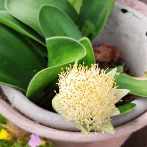 🍀🤍💛マユハケオモト💛🤍🍀 (眉刷毛万年青) 別名 ハエマンサス ヒガンバナ科ハエマンサス属の顕化植物 葉は「象の舌」「象の耳」 花は「シェービングブラシ」「絵筆」 と呼ばれている