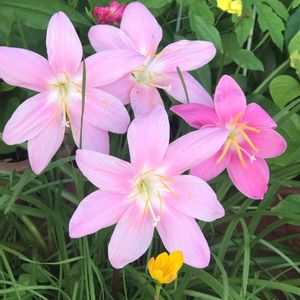 花達の楽しそうな世界を垣間見たような、、(^^) 黄色のタマスダレは 初めて見ました。 赤い花は何でしょう?←チェリーセージのようです。教えて頂きました。