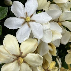 雨上がりの庭で くちなしの香りの やさしさに包まれたなら きっと♪ くちなしが咲き始めました ふんわりと甘い香り♡