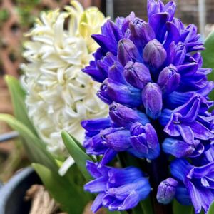 こんにちは🍀 桜🌸さくら🌸サクラ.•*″*•. ♬ どこも満開😍 緩やかな風が吹いています🍃 💟 ヒヤシンス グラデーションマジックブルー (Hyacinthus orientalis) 球根多年草 🪴鉢植えのヒヤシンス🤍💜 量感たっぷりに咲いてくれました😄 甘い香りは ココア? 来季は もっと種類を増やして トライしますー😄