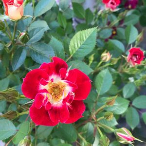 こんにちは 今日の薔薇🌹 真ん中の2枚 モーリス ユトリロ 絞り、香り、色も大好き❤ 一番咲きと三番咲き 表情が違います✨ 左上の🌹は真紅で大輪です✨ 左下の🌹は優しい赤色 お花は小さめです💕 黄色の薔薇の蕾も色付き開始❣️ 小山内さんの🌹フィネスも明日には咲きそう😊