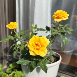深い黄色のミニバラを再びお迎えしました。前回は雨に打たれて星にしてしまったので、今回は軒下で育てようと思います。蕾も2つ上がってきてるので楽しみです。