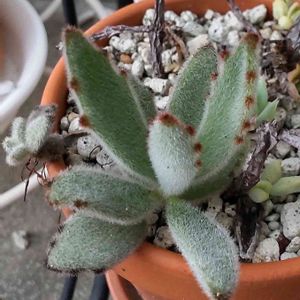 18日にちょろっと出てた葉挿し月兎耳🐰 移動の際に落ちた葉っぱをダメ元でポンと置いたら出てきたすごいやつ……。 耐寒性が低いはずが、このまま屋外で霜除けした程度で越冬するとかただ者ではないな、このウサミミ……✨🐇 なお、月兎耳は本来耐寒性が低いので、最低気温が10℃前後を下回ったら屋内避難させるのが良いとのこと。 ちなみに、後ろの枯れ木は同じく耐寒性の低いポーチュラカリアの亡骸。耐寒性は大体同じだったはずですが……❓✨🐰❄️