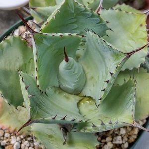 "アガベ ポタトルム"の痛そうだが魅惑的(?)なロゼット🪴 この葉の縁を取り巻く棘と模様で、アガベ全体が回転して渦を巻いているように見えます。私だけかもしれんけど……😵💫🌀