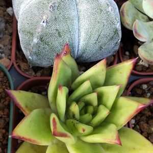 トゲトゲしたやつと、丸っこいやつの揃い踏み。 アストロフィツム属の"四稜鸞鳳玉"と、エケベリア属の"アガボイデス レッドエッジ"。ついでに見切れたプリドニス⬜🪷 よく見たら、アガボイデスの葉っぱが鸞鳳玉に引っ掛かって、ロゼットが歪んでるっぽい❗😬 アガボイデスは猛暑でちょっと弱っている様子ですが、鸞鳳玉は全く問題なし。 ただ、そろそろ植え替えないと鉢の大きさが……🙀 暇を見つけて…。いや、まだ残暑がそれなりに残ってるからまだ植え替えは…😮💨🏜️