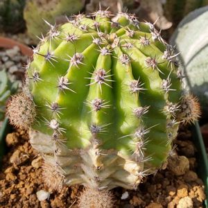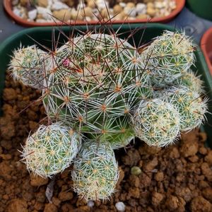 百均の名無しサボテンと、勝手に茎が落ちて根付いたクラッスラ属の"ブロウメアナ"のコンビ🌵🤝🌱 ハンギング仕立てよろしく、垂れたブロウメアナがいい感じの雰囲気になっています。そして、メインのサボテンは6月と比べて赤い新棘が出現❗ よきよき成長具合🔴🤤 しかし、相変わらず名前が分かりません🙄 棘がやたら長くて反り返っているところからして、いわゆる強刺類と呼ばれる種属と見て間違いないのではと推測中。 ダイソーでは、フェロカクタスはフェロカクタスと明記されていたため、フェロカクタスはとりあえず除外。 ギムノカリキウムは、販売時期によっては名が明記されているので、こちらはグレー。 エキノカクタス属……も強刺類と呼ばれる代表だけど、こんな棘の品種なんてあったかな❓ 残る強刺類の筆頭はテロカクタス、メロカクタスだが、果たしてこやつの正体は……❓🤔