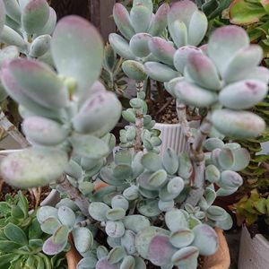 隣の"アロエ ダップルグリーン"の鉢を勝手に使って、子持ち蓮華のマネをしてる"エケベリア ロスラリス"。 向かって右が親株で、茎が伸びた先にある左の株は、元々は花茎だった子株。 花が咲くものと思っていたら花芽が突然消失して、先端部に生えていた葉が徐々に増えてロゼットを形成し、そのまま子株になってしまいました🙀🌱 その後、茎が垂れてまるでランナーのようになり、現在の姿に。 茎が枝分かれした樹木状になるかと思っていたんですけどねー。こういうこともあるんですね🙄🌳