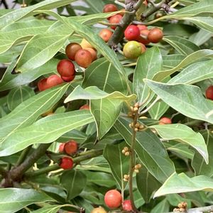 シロダモ クスノキ科シロダモ属 常緑高木 本州山形県宮城県以西、四国、九州、南西諸島に分布 山地や低地の比較的湿潤な森林に生育する。 庭木や防風林としても植栽される。 シロダモの名は、葉の裏が白いタモ(クスノキ科の樹林)の意味とされる。 葉は互生し、長楕円形〜卵状長楕円形で、8〜18✕4〜8cm。先端は尖り、全縁で葉脈が目立つ。表面は無毛で光沢があり、裏面は絹毛が多く粉白である。 花期は9〜11月 雌雄異株 花は小さく淡黄色で、散形花序である。 果期は10〜11月 お花と同時に赤い実を観賞できる。果実は液果で楕円形球状で長さ12〜15mmである。この果実は昨年の秋の花の実である。