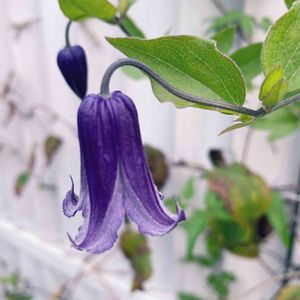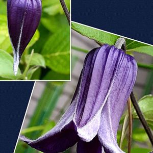 「クレマチス ロウグチ」です💜 我が家で初めてのベル型のクレマチスです🔔 くるんとカールしていて愛らしいですね~🥰 車庫の奥の小さなスペースで、かわいく咲いてくれました✨