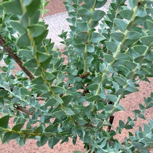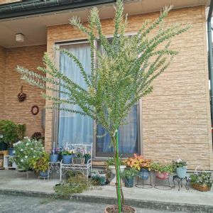 三角葉アカシア 鉢植え4年目かな? この子も高さ2m弱位 倒木防止でいつもカーポートの柱に括りつくけられてます😇 室内サンルームへの移動前に、全体像の記念に撮りました🌿