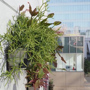 おはようございます。 14階の農園から下に降りる途中の壁面には いろいろな植物が飾ってあり撮りながら♪ リプサリスです。 正面はルクア大阪なんですよ。