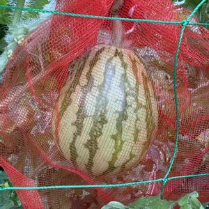 夕方仕事終わりに収穫ネットを買って空中吊り作業。とりあえず5玉。 楽しみだなぁ😊だけど、これ黒小玉なのにはっきり縞模様どういう事?