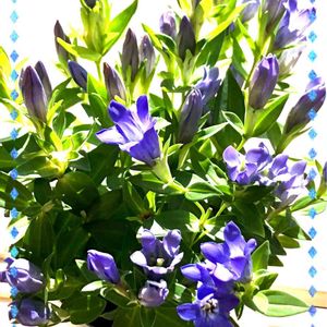 窓際で☀️に煌めくリンドウ✨ お菓子屋さんの店内より😁