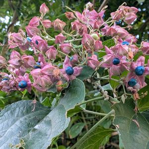 クサギ(臭木)の実が色づいてきました。クサギの実 は天然の染料::藍と並び、青い色を出す天然染料として貴重なものです。 シソ科クサギ属の落葉小高木です。 ノブドウの実も絡みついてます。