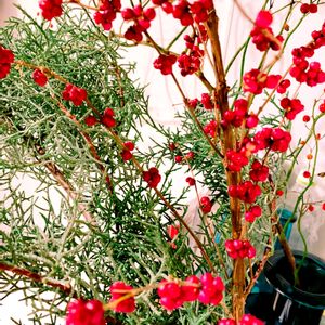 6〜7年前、小さな寄せ植えを買いました。 20cmくらいの枝に、赤い実が印象的❣️ それがなんと大きく(60〜70cm)成長して、赤い実が鈴なりです。 今年は特に沢山の実がなってます❣️