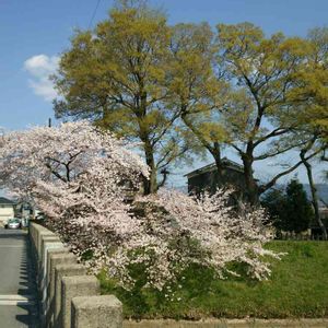 お天気の良い春の日。橋から見た桜と木々の若葉が 何とも言えず きれいでした。