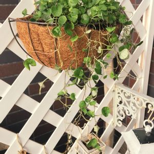 ディコンドラエメラルドフオールズ。 このラティスに何か上から垂れ下がるのが欲しかったので。 ガーデンショップでこれ可愛い!と思ってひと鉢持ち上げたら隣同士でからみ合っちゃってて大苦戦、炎天下の中で汗だくでやっとこ取り出してお持ち帰り。 1ヶ月くらいでわっさわっさになるらしい♬