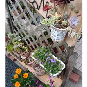 玄関に西日☀️が当たるのを少しでも緩和しようと毎年ラティスを置いています 多肉植物の寄せ植えやら何やら見ての通りです😅 以前作ったウエルカムボードも吊しました 朝顔が伸びて来たら朝顔に変えますよ