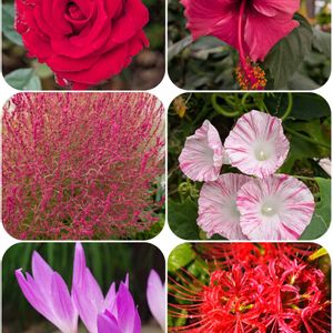 🏷 真っ赤な火曜日 参加します ↗️ ミニバラ(ミニ薔薇) ↗️ ハイビスカス(ブッソウゲ) ⬅️ コキア(ほうき草) ➡️ アサガオ(朝顔) ↙️ コルチカム(イヌサフラン) ↘️ ヒガンバナ(彼岸花) 小庭&カーポート下にて 25.10.12