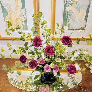 5月8日 フラワーアレンジメント スカビオサ/グランワイン カンパニュラ/チャンピオンホワイト バラ/ナイチンゲール ブプレリューム,ユーカリ
