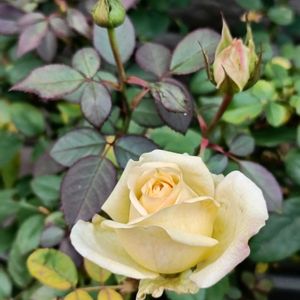 5月にホームセンターからコルダナシリーズの、外側の花びらにわずかにグリーンが入る白バラをお迎えしました たくさん咲いて一段落した後、今クリーム色のバラが咲き出しました よく見ると3株植わっていて、3種類植わってるの?もう一つは何色だろう、と思ってネットで検索したら、パールコルダナという白バラが高温期にクリームレモン色になることが分かりました 秋には何色になるのだろう 白に戻るのかな ミニバラにしてはお花が大きく丸弁高芯咲き フルーツ系の香り アンジェラやアイスバーグを作出したドイツコルデス社