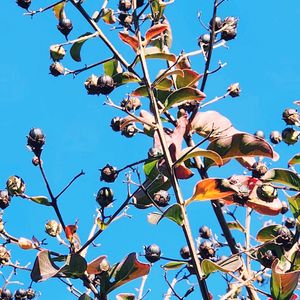 【サルスベリ・百日紅】② 朝からの連投失礼します。 現在の我が家のサルスベリの木。葉っぱも落として、木の実のカラのみが残っています。もともとは丸く→割れ→中から黒い種を落とします。この実をクラフト材料として使ってます。可愛らしいフォルム❆❆❆𓅪❆❆❆🐈🎵♪̊̈♪̆̈