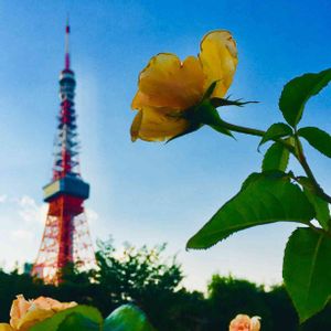 大江戸線 赤羽橋駅近くの 芝プリンスホテルの庭園で バラがタワーを見つめていました これ、合成に見えちゃいます(^з^)
