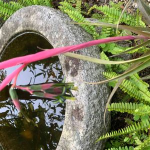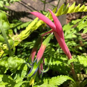 昨年植えた、ヨウラクツツアナナス(女王の涙)の花が、シダの隙間からこっそり顔を出していました。 エキゾチックだけど派手じゃなく綺麗です。 何度も雪に埋もれてしまったのでダメかな〜って思っていたけど頑張ってくれました。