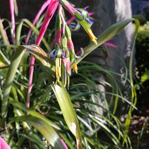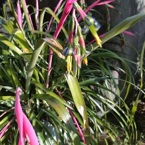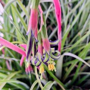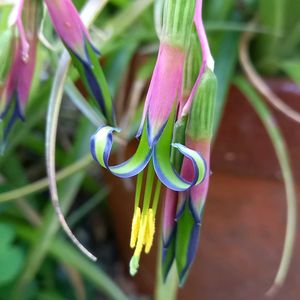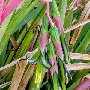 ①②③ヨウラクツツアナナスが咲きました🥳🎉 緑の花に紫色のストライプ、黄色いおしべにピンク色の花序ととても綺麗な配色です😊 チラ友のrionさんから頂いたビルベルギアなので開花してくれてとても嬉しいです👍 ④⑤アルブカ フミリス(仮) ホームセンターでボロボロの見切り品だった株ですが、なんとか開花まで成長してくれました☺️ 緑に白のストライプとこちらはフレッシュな雰囲気です✨ 先端は黄色く色づいてます。 香りがあると教えてもらったので確認してみたらとても良い香りがしました🤤
