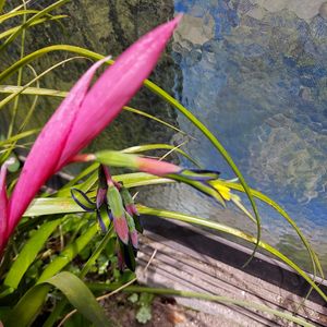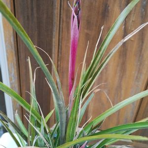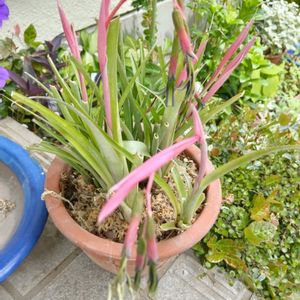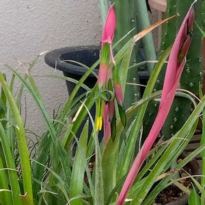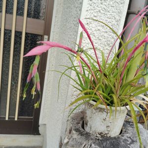 購入して数年が経過していますが毎年この時期になるとピンクのツボミ?が膨らんで変わった形の花が咲きます。 葉は硬めでピンとした感じで1年中、常緑でほとんど手間はかかりません。 アジアンぽい植物です。