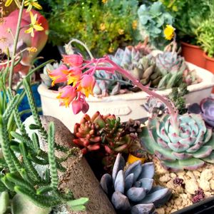 風除室の多肉ちゃん達も元気\\\٩( 'ω' )و/// エケさんの断水で、もらい事故死のセダムちゃん達(⌒-⌒; ) ミイラ化しちゃって隙間だらけ💦 でも、いくつかのエケさんはお花付けてて可愛い(⑉• •⑉)❤︎ 特にこの桃太郎のお花は丸みを帯びた黄色とピンクのベル型🔔 お花パッツン✂️しちゃう方もいるけど、私はこのままで( ⸝⸝⸝ᵕᴗᵕ⸝⸝⸝ )