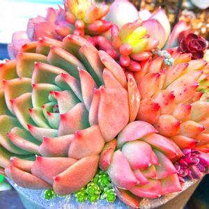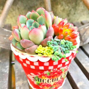 @megu.matsu2929mei さんの #グラデーション鉢_mei 💕 に 寄せ植え‼️ 3号鉢だから沢山の苗をムギュっと詰め詰め😊 鮮やかなデザインの鉢だから 多肉苗も生き生き〜😆😆