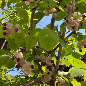 こんばんは🌃 今日のお花💜アケビ💜 ①②③今年4月、散歩コースで見た自生の五葉アケビ…ハナズオウの木に絡まってぶら下がって咲いていました 雌花と雄花が同株で面白い形です ④⑤三つ葉アケビ…近くの民家のフェンスにびっしり咲いてます(今年4月のpic) 先日見たら半分は収穫済み?で紫色に色づき始めた実がまだ沢山ありました😋