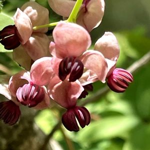 今日のお花〜アケビ〜 可愛らしくて私の好きな色🩷 (4月15日のpicです) アケビ科 アケビ属 雌雄異花で雌雄同株 花序の先端に雄花 基部に雌花が咲きます 雌花は大きく雄花は小さく数個まとまって咲きます どちらも花弁は無く、がく片が3枚花びらのように見えます 私が撮ったのは雄花でした 実がなってないかと見に行きましたが何と木が刈り取られていました 残念! 花言葉「才能」「唯一の恋」 🏷️今日のお花