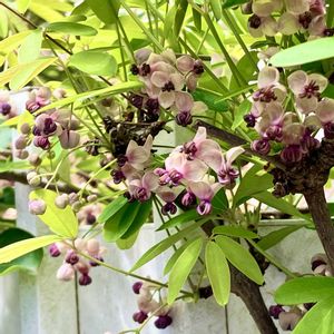 こんにちは😃 4月初旬に撮った 今日のお花 ✾アケビ✾ ミツバアケビ いつの間にかフェンスに 絡んでいました😮 実は収穫できなかったけど ツルはリース等に 活用できそうです✨🍀