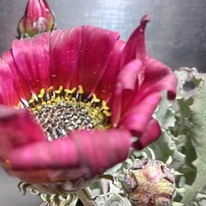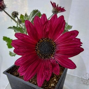 この子が 最後のお花かな。 処分コーナーで出会い 超ラッキー⚡️ この厚みのあるギザギザなシルバーリーフに 黒味ワインレッドな花びらが とても素敵✨️✨️ 中央のシベも黒艶あってお似合い⚡️⚡️ よくみたら あちこちにアブラムシ😣
