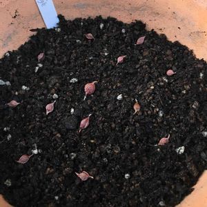 Oxalis obtusa Flame ちゃんと並べて植え付けたのに、、、壁まで地中を這ってから発芽するタイプ?