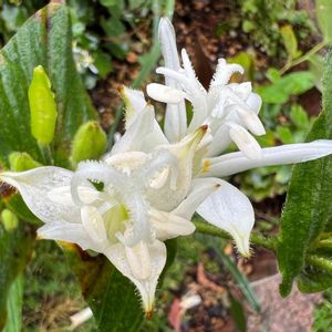 おはようございます☔️→☁️ 雨の中咲きました(*´꒳`*)🎶 真っ白…庭で咲くの初めて¿🤔 どうしたのかな… 今日も笑顔で過ごせますように🤗