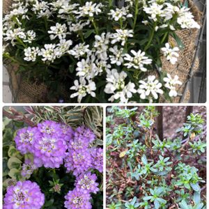 ✨今日のお花 キャンディタフト✨ イベリスとも呼んでいますね‼︎ 大好きなお花です💗 上 今年の初春のpic 左下 アメジストクィーン 大事にしていましたが夏越せず💦 また会いたいわぁ💕 右下 上のキャンディタフトの今の状態 夏越しましたが植え替えした方がい いかなぁ また咲いてくれるかなぁ😌