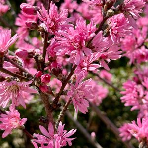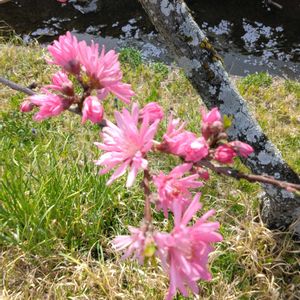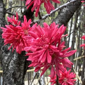 ★キクモモ(菊桃)★ バラ科の落葉小高木。 花期:3月下旬〜4月上旬 花弁が細長く多数つき、菊の花に似る。花は直径約4㎝、花弁は濃紅色~ローズピンク色、雄しべが弁化した八重花。花期の終盤には、色が薄くなる。 2025.4.7 上野不忍池にて📱