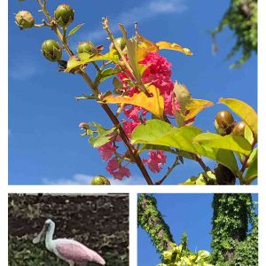 サルスベリとつる植物 池にベニヘラサギ 店の駐車場にて