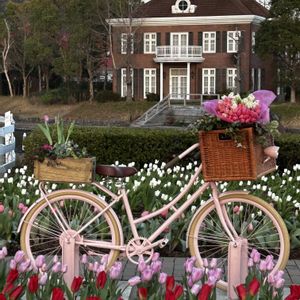 🌷長崎ハウステンボス🌷 ①🚲🌷可愛い自転車…子どもたちが嬉しそうに記念撮影してもらってました〜💕^ - ^💕 ②とても可愛いらしいピンク色の🌷思わず立ち止まって📱パチリ♡ ③時刻は18:10を過ぎました 日が落ちて来ましたががまだまだ明るい〜☀️