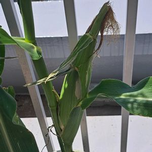 とうもろこしの成長記録 収穫前のとうもろこし ヒゲが茶色くなって実が斜めになり 採ってくださいと言わんばかりに