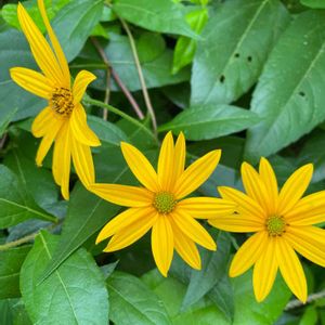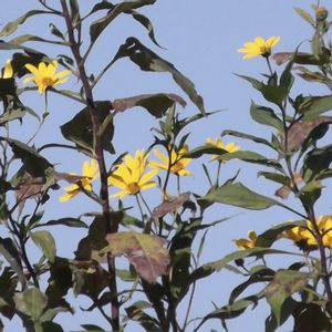ひまわり? キクイモの花です。 ちょっと傷んで来てしまいましたが、一本の茎から何輪か咲いています。 体にいいそうだけど、塊茎を食べるより、私はお花を見てる方が好き!