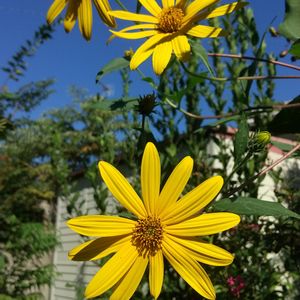 昨年採り残したお芋から 菊芋の花が咲きました♡ 物置の屋根を越え黄色いお花がよ〜く目立っています💛