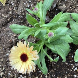 なんて優しいピンクのお花🌸 ジャンボブラキカム ミスティーピンクです。 イングリッシュデージーを少し大きくした感じのお花で、咲き進むと白に変化していくそうです。 四季咲き性も魅力です❣️ 今年は種まきをしなかったのでお迎えしました。 カレンデュラ コーヒクリーム。 この開き初めの姿にエネルギーを感じます💫✨