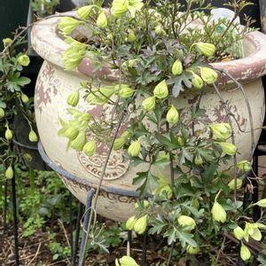 おはようございます。 常緑早咲きのクレマチス🌿#ペトリエイ はコンパクトに育てています。(^_^;)DAISOの鉢 開花したら吊るす予定です🙋🌸