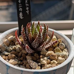こんにちは👋😃 我が家の多肉植物 1️⃣桜吹雪 小さな子達は夏に消えてしまい、この子達だけ残りました😅 縁の🩷が可愛い 2️⃣桃太郎 お迎えしたときはふっくらした可愛い姿でしたが、夏の間に薄くなり広がったしまいました(笑) 3️⃣ハオルチア十二の巻き 大きくなったので株分けしました☺ 4️⃣黒法師さん夏に葉が落ちて悲しい姿になりましたがまた葉が出て来て復活しました☺ 5️⃣李婦人、なんとか生き残りましたが間延びしてしまいました。まぁ良いか(笑)